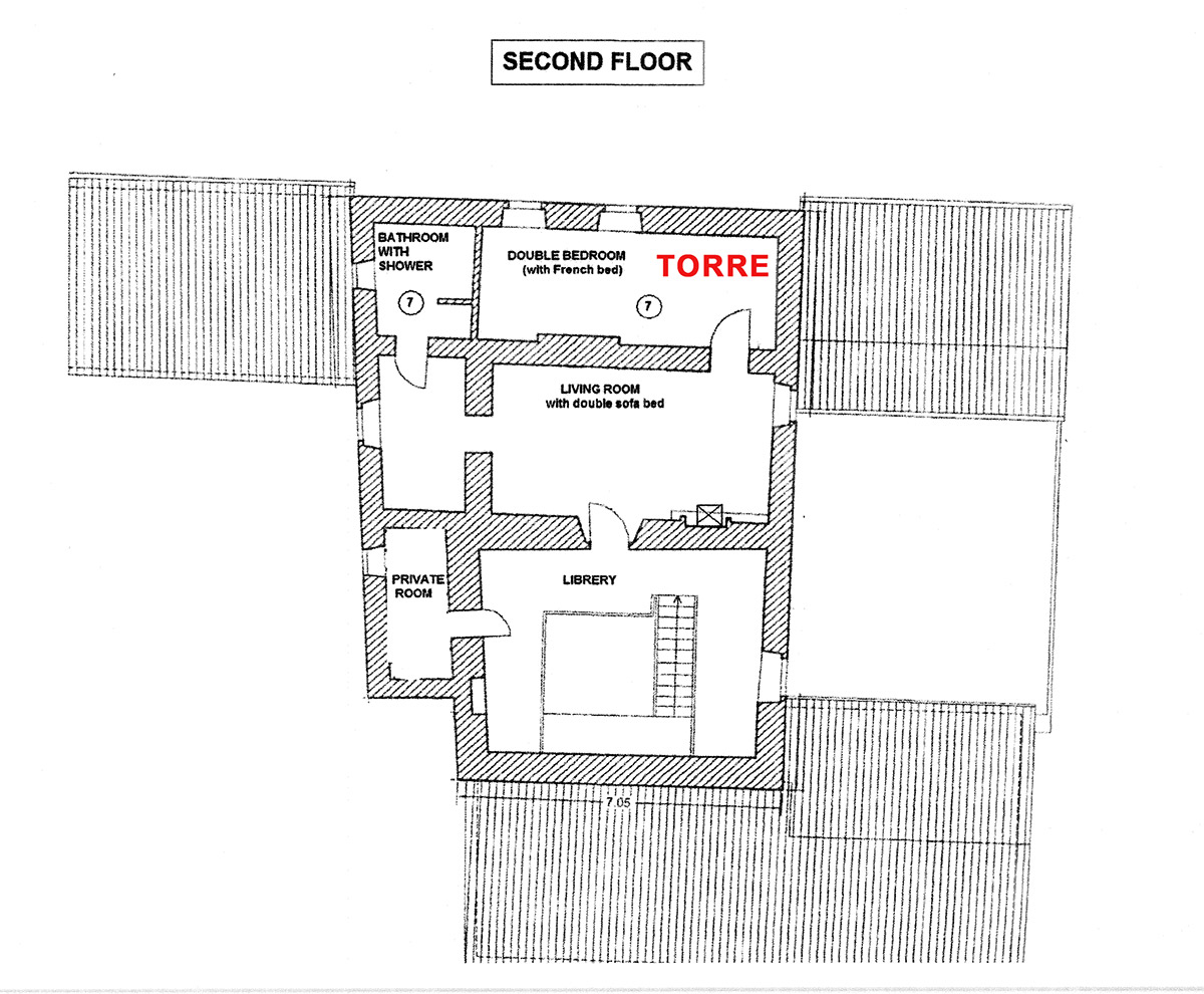 In this environment is the ultimate suite, the TORRE room. The room consists of a master bedroom with a double bed and a living room with fireplace and double sofa bed.