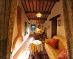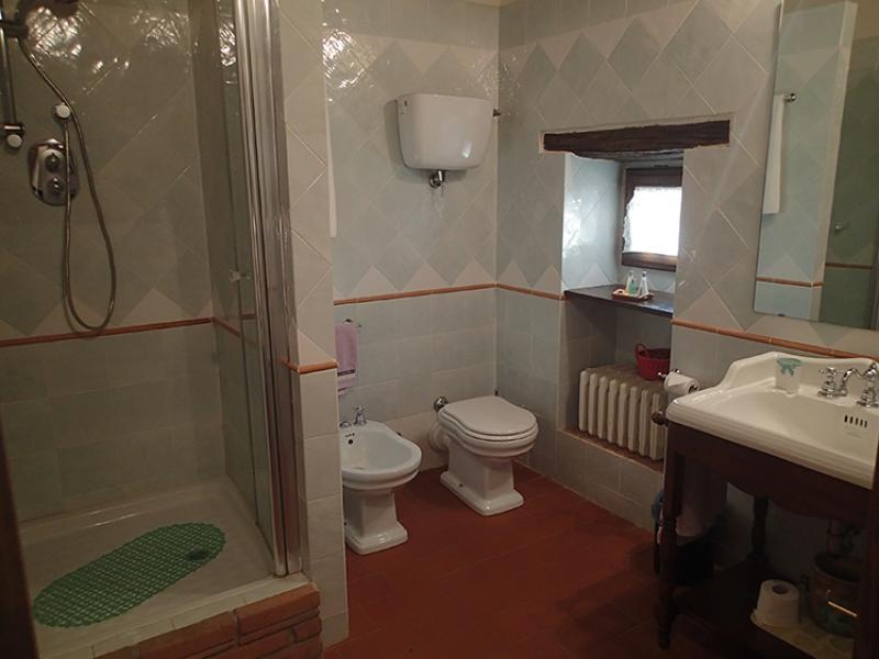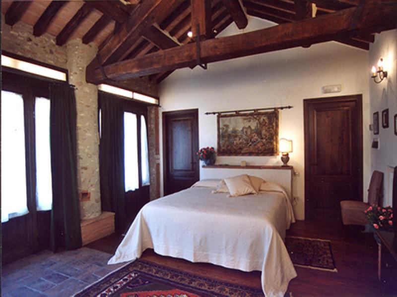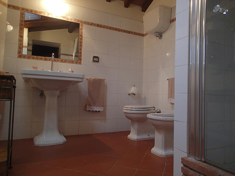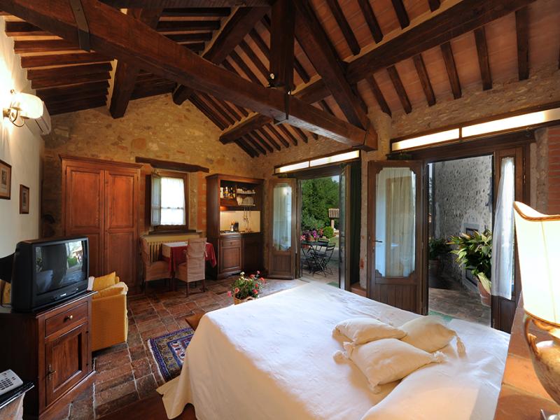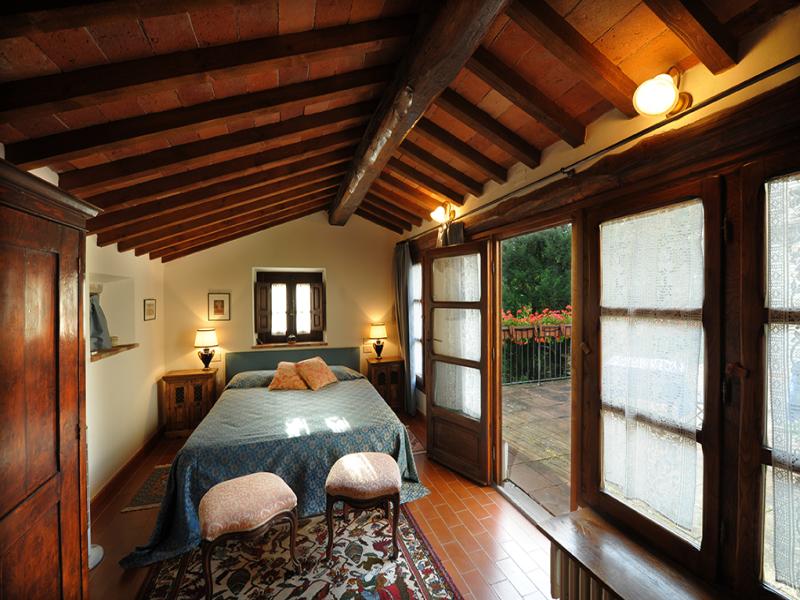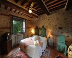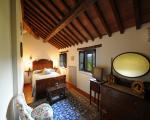The name of this country cottage is Capriata and is about 30 m from the main house. This environment is arranged in a single plane, its name recalls the great wooden truss placed above the bed the Italian name is Capriata. The wooden beams, columns and tiles are exposed. The floor is partly wooden part was recovered the ancient terracotta that was found in the chapel next door. You log in through a French door that leads directly from the ground floor in the master bedroom and is equipped with two bathrooms, a disabled toilet and a bathroom with hydro-massage shower. The room has a classic wardrobe and one in which there is a small kitchen very popular with guests because equipped with everything needed for cooking. The room has its own garden with table and chairs, suitable for 2 or 3 people.